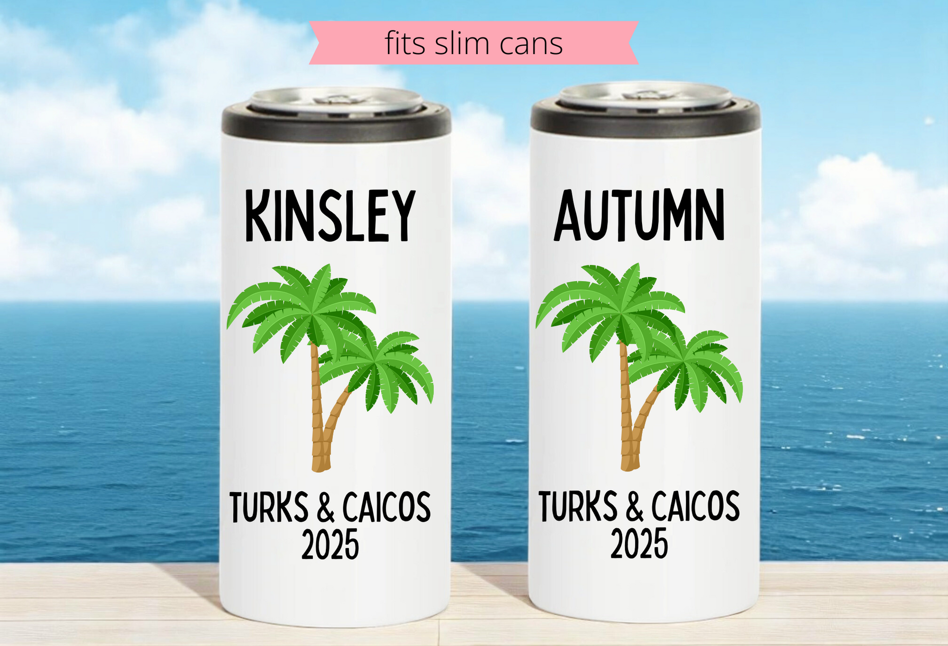 Personalized Palm Tree Trip 12oz Skinny Can Coozie – Custom Slim Can Cooler for Vacations & Bachelorettes