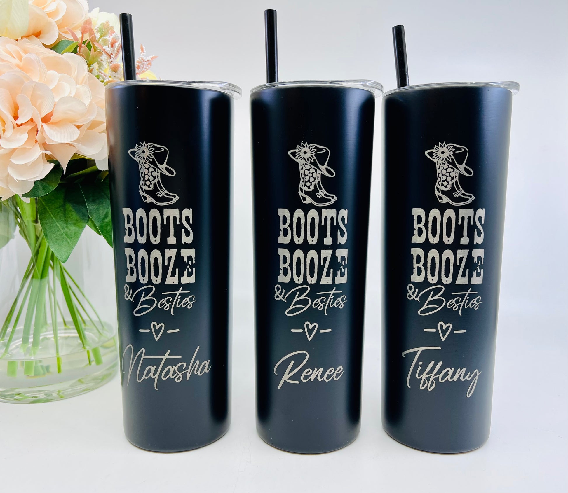 Boots Booze and Besties Tumbler – 20 oz Skinny Laser Engraved, Personalized Cowgirl Bachelorette Favor