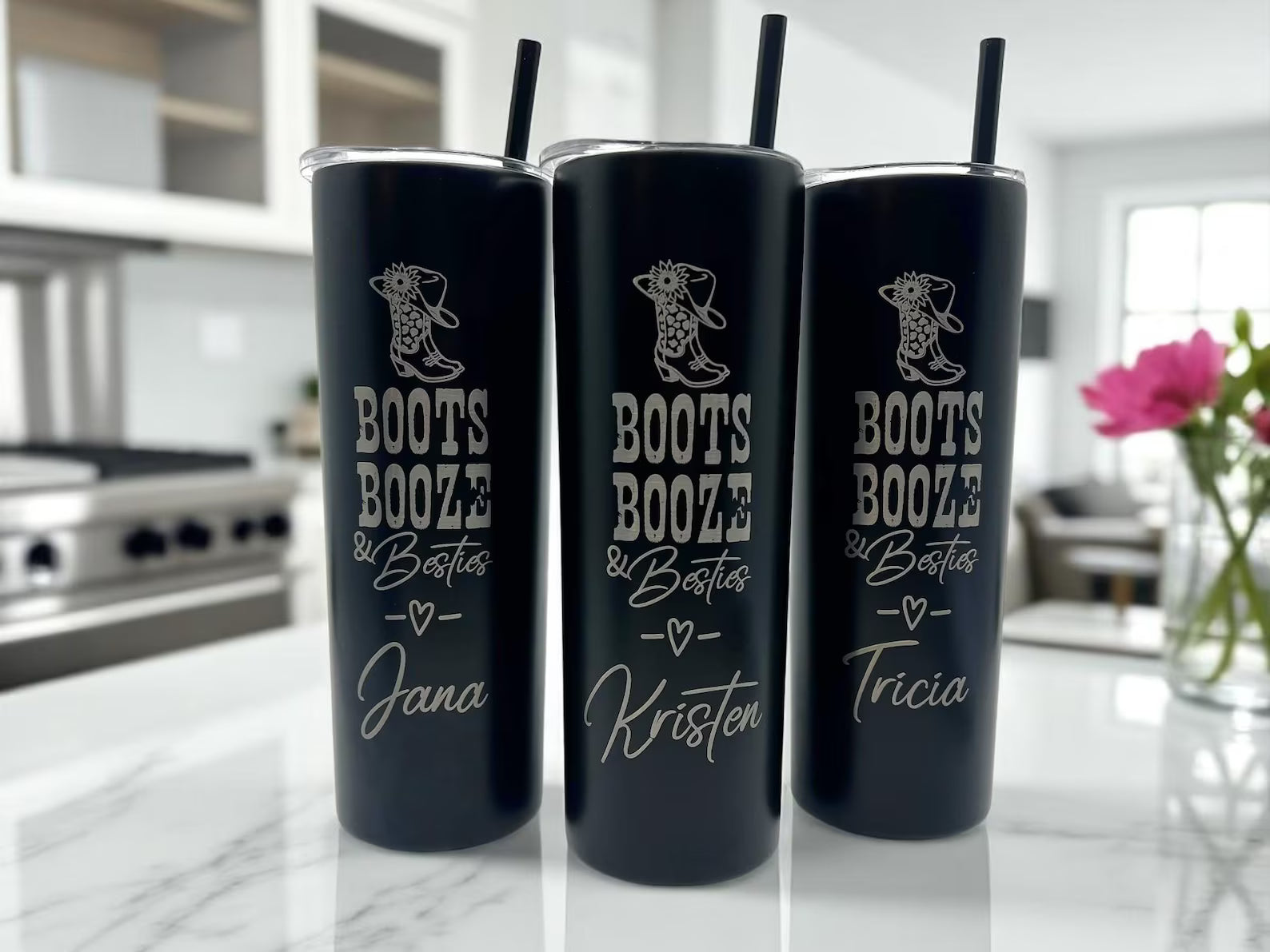 ⭐ Laser engraved with “Boots, Booze, and Besties” and a cowgirl boot