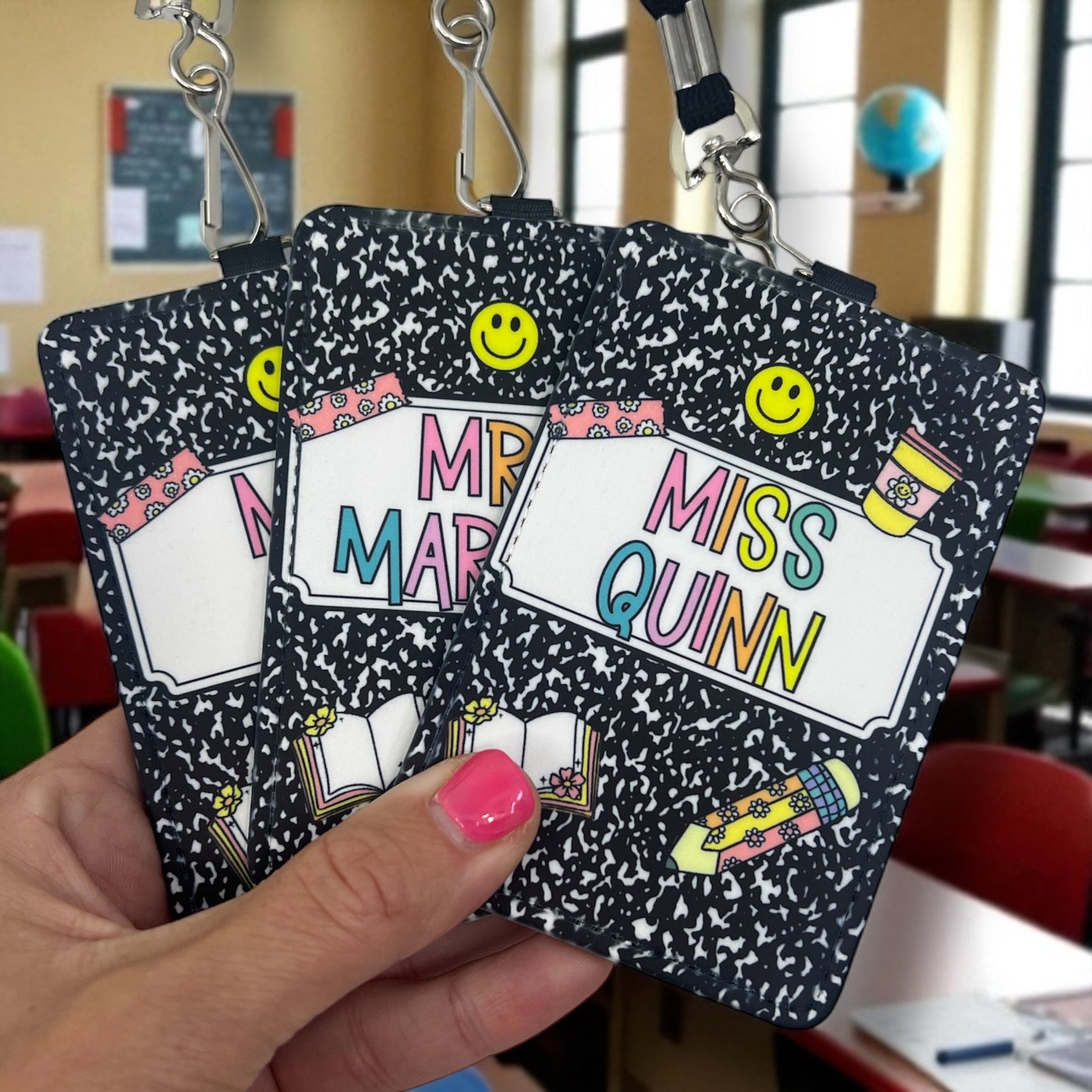 Personalized Teacher ID Badge Holder – Composition Notebook Design with Lanyard