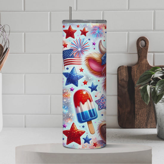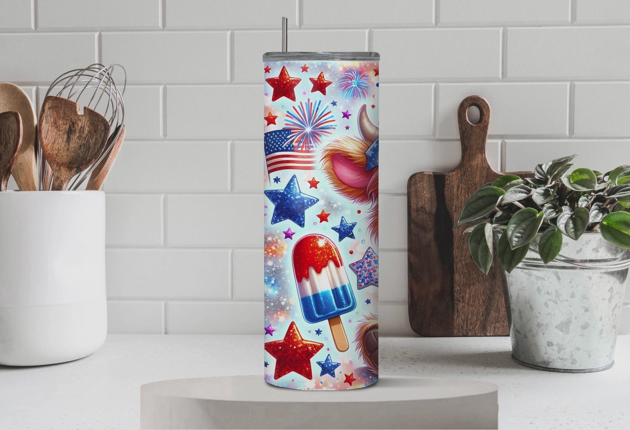 Patriotic Highland Cow 20oz Skinny Tumbler – Sublimated, Stainless Steel, Insulated, Includes Straw