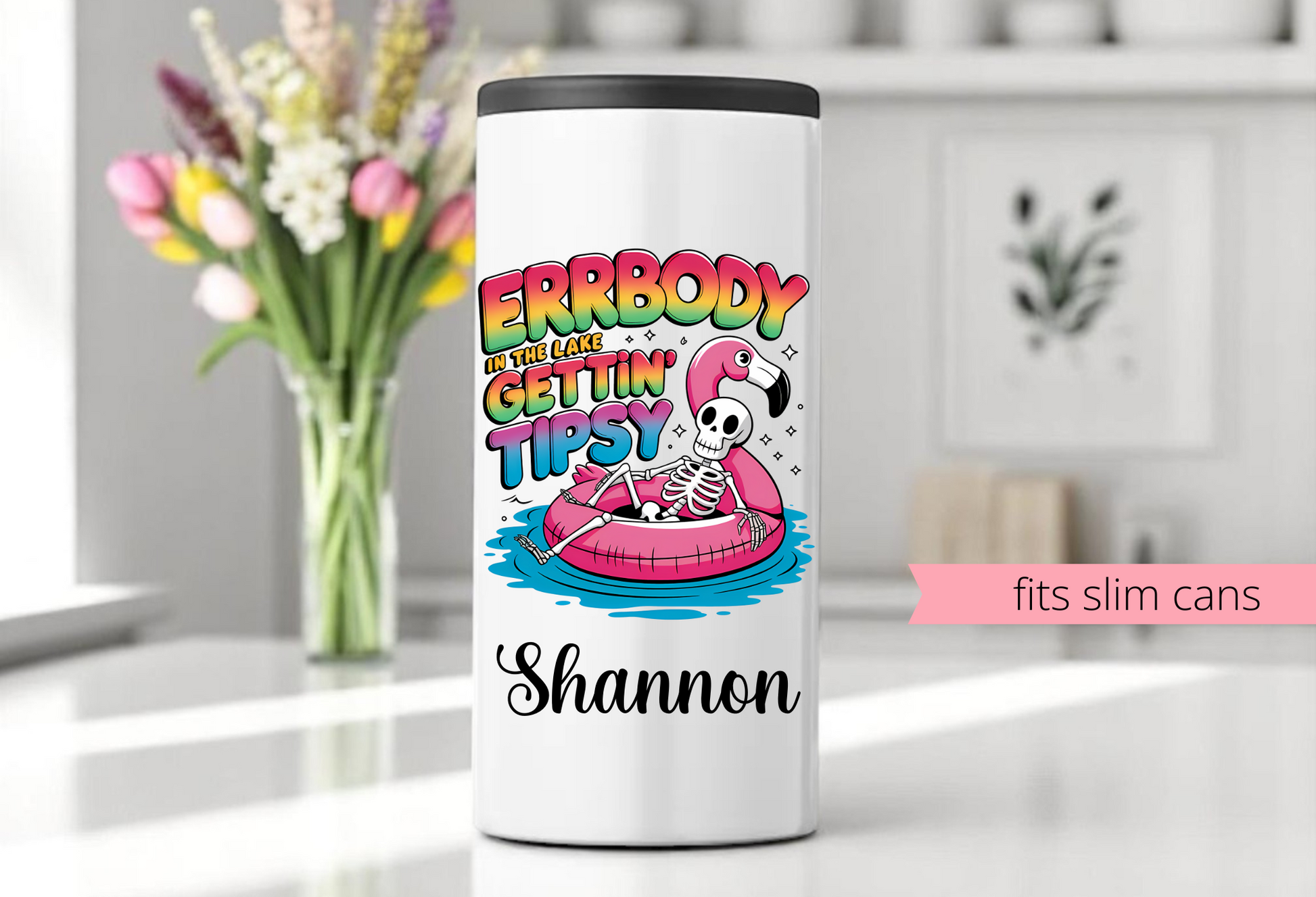 Each can holder is sublimated with your choice of graphic and customized with your name – perfect for group photos, party favors, and unforgettable adventures. Fits standard 12 oz slim cans like White Claw, Truly, Red Bull, and more.