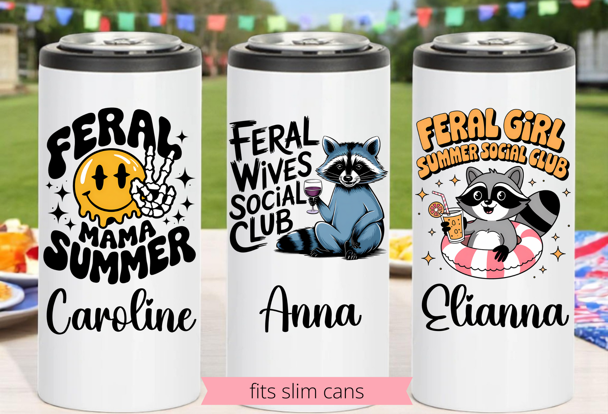 Unleash your wild side with our Feral Girl Summer Personalized Slim Can Coolers – the must-have drink accessory for hot girl summers, chaotic girls’ trips, beach bashes, and bachelorette weekends! With a variety of fun, bold, and a little unhinged "Feral Girl Summer" graphics to choose from (think raccoons in pool floats, flamingos, sunglasses, and more!), these skinny can coolers are as wild as your summer plans.