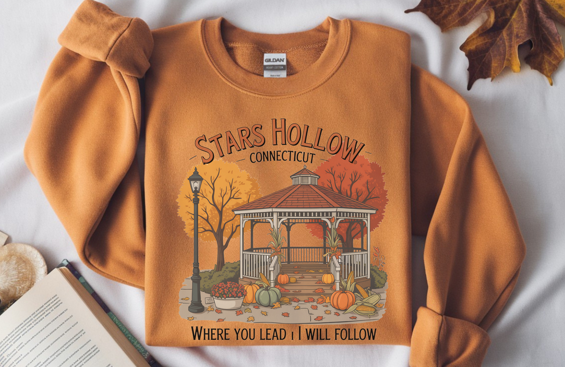 Channel all the cozy small-town charm with our Stars Hollow Fall Scene Sweatshirt. Featuring a beautifully illustrated autumn design and the iconic Stars Hollow lettering, this Gildan 18000 unisex crewneck is perfect for crisp mornings, coffee runs, and Gilmore Girls marathons.