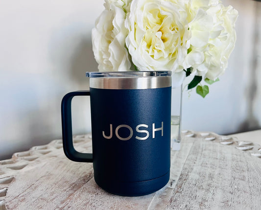 Personalized 15 oz Insulated Stainless Steel Coffee Mug – Laser Engraved with Name or Saying